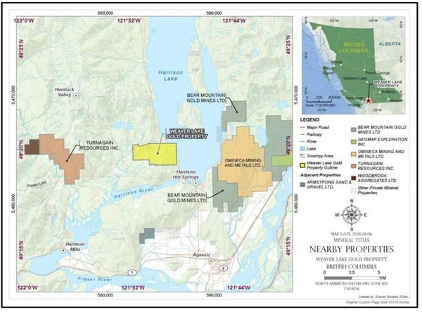 The Weaver Lake Project is a 725-hectare gold-silver exploration property in the New Westminster Mining Division. The project is located 13 km north of Highway 7 near Harrison, British Columbia. Access is via paved highways and forestry roads, with most areas accessible by vehicle, and regional infrastructure and servi