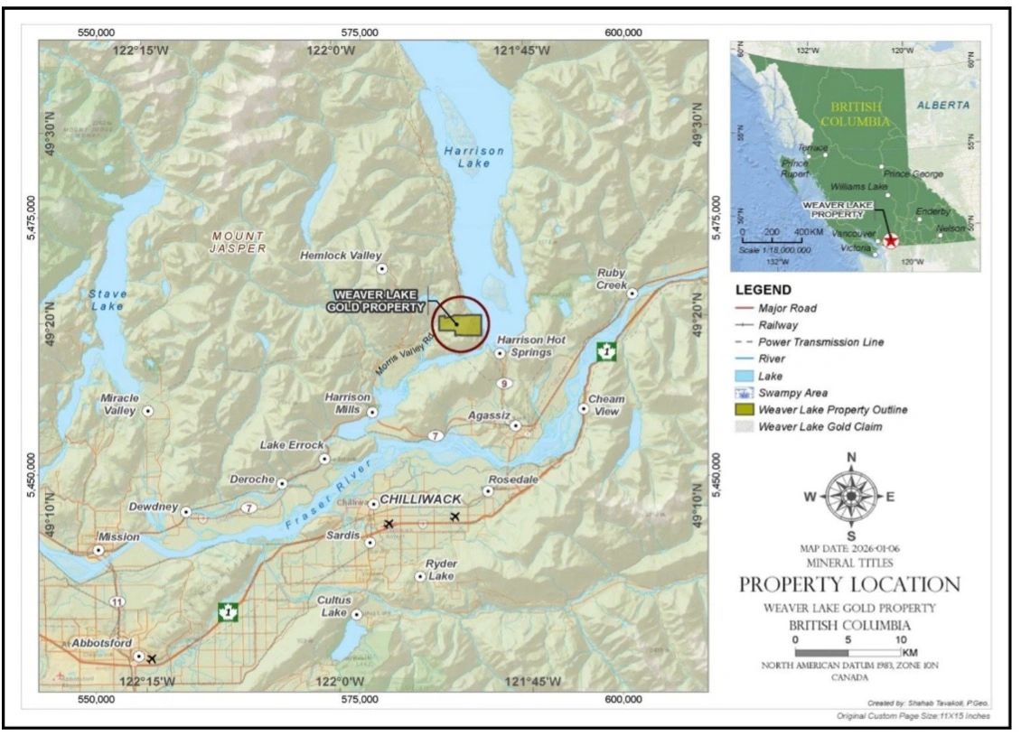 The Weaver Lake Property is located within the Hope–Harrison Lake area of southwestern British Columbia, a region with a long and well-documented history of mineral exploration dating back to the Fraser River gold rush of 1858. Since that time, the district has been the focus of numerous exploration programs targeting precious and base metal mineralization associated with volcanic, volcaniclastic, and intrusive rock assemblages. This extensive regional exploration history provides important geological context for the Property.